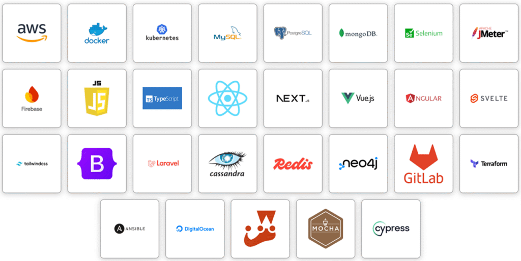 We use React or Next.js for fast front‑end interfaces; Node.js (Express/NestJS), Django or Laravel for backend logic; PostgreSQL, MongoDB or Firebase for data; and Docker‑based DevOps with AWS/Kubernetes.